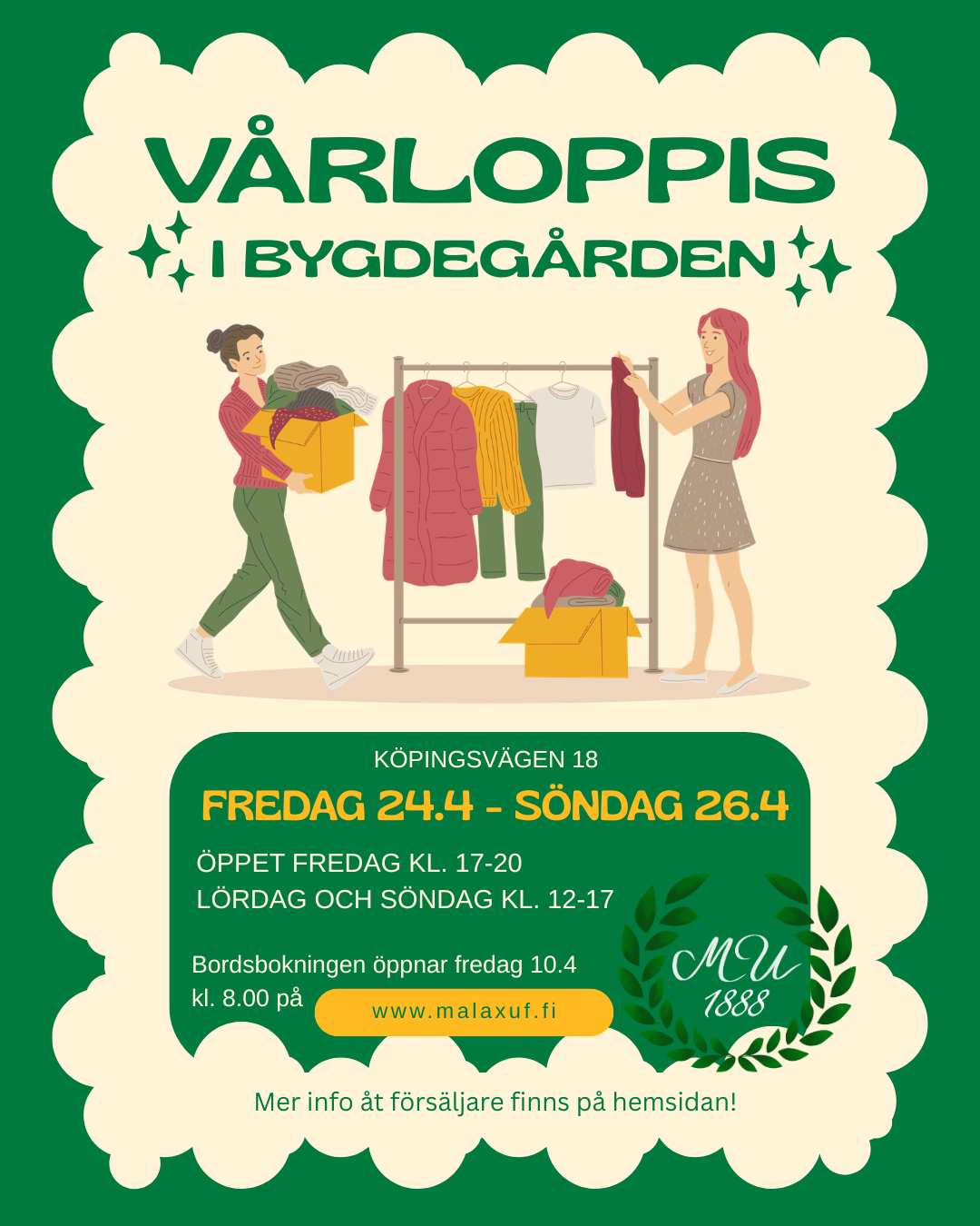 Försäljare får föra sina saker till Bygdegården torsdagen den 23.4 kl. 18-20. Använd våra prislappar som ni hittar här nedanför. Man får sedan hämta sina lappar samt saker måndagen den 27.4 kl. 18-20.
